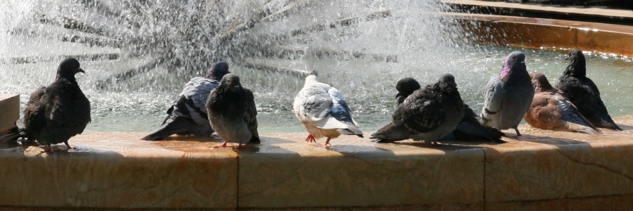 Bunte Schar von Stadttauben bei ihrer Sommerfrische am Brunnen in der Fussgängerzone Foto: Gerd Wellner |